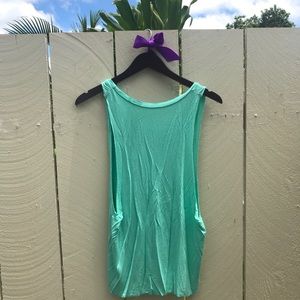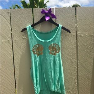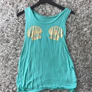 Lightweight teal muscle tank with golden shells along the chest! Lightly used— willing to negotiate price! Best photo for color is one of the last two!