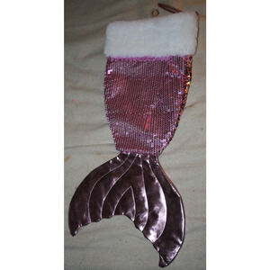 Pink and mirror sequin Mermaid tail Christmas stockings with white brim on top. Instead of using a plain traditional red or green stocking use this that measures about 21 1/2" tall by 10 3/4" wide Christmas stocking. Made by Holiday Time. Make An Offer.
