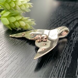 This spoon pendant was handcrafted by an artisan using a genuine vintage silverplate serving spoon! It’s made to look like a mermaid, whale, or fish tail fin. It is extra unique with a copper rivets and copper flower making it OOAK! Great for beach or other Summer vacation wear! Given a polished oxidized finish that may reflect a rainbow of colors.