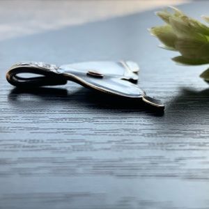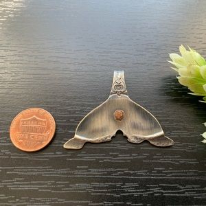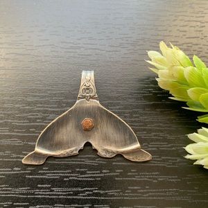 This spoon pendant was handcrafted by an artisan using a genuine vintage silverplate serving spoon! It’s made to look like a mermaid, whale, or fish tail fin. It is extra unique with a beautiful hammered copper rivet. It also has slight hammering on the bottom to reflect the light and gives it a more handmade rustic look. This would need a smaller width chain as the bail is smaller.