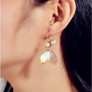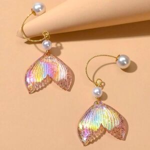 Mermaid Tail Holographic Pearlescent Metallic Pearl Accent Charm Drop Earrings