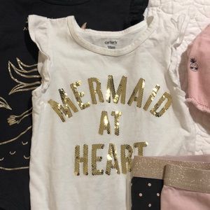 Light pink, slate gray, white and gold 5 piece set. 2 leggings, 2 onesies, and 1 pair of cut off shorts