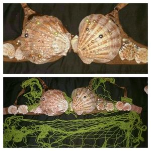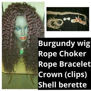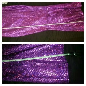Mermaid costume worn once. Bra 34C. Netting is not attached to bra but was looped through and around once on. Skirt has no label, but stretches to fit M-L. Skirt is purplish pink color and flares at bottom. The crown has two berette clips to attach to hair. Pic 4 lists all other accessories. Price includes all things pictured. Can reduce by $30 without wig.
