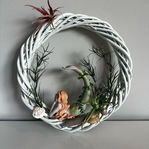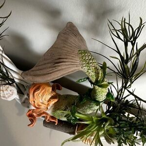 Mythical Mermaid Beach House Themed Handmade Wreath, One Of A Kind! This Wreath Centers Around A Beautiful Red Haired Mermaid Surrounded By The Beach And Sea Life. The Material Used Are Wood, Sea Shells, Plastic Greenery, Ceramic, Glitter, Paint. She Would Look Great Either On A Door Or In A Bathroom, Appropriately 18” Diameter 🧜♀️💕🧜♀️