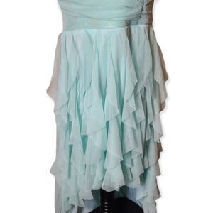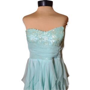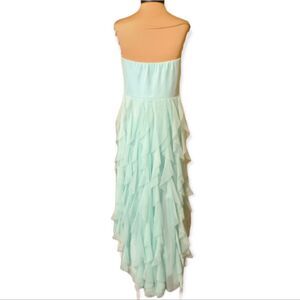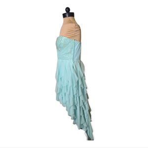 Mermaid Style Mint Green Ruffled High Low Prom Dress, Sequined strapless bodice with lots of layered ruffles with high low hem line.