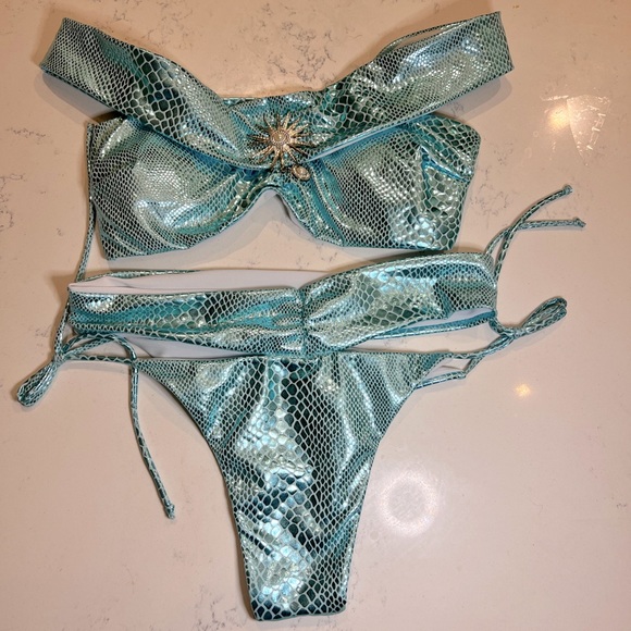 So pretty. Bikini with metal brooch. Never worn. Was a sample for a brand.
