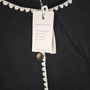 This black Merokeety knit cardigan jacket features a round neckline, button-front closure, and contrast white scalloped trim along the edges, pockets, cuffs, and hem. The viscose-blend knit offers a soft, medium-weight feel, and the piece includes two front patch pockets and three-quarter sleeves. Clean lines and simple detailing give it a structured yet easy silhouette.