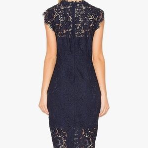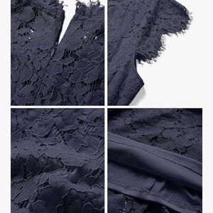 Merokeety Dress, Size M, New in Bag. Navy lace midi dress has zipper back closure, slimming sheath style, full lace with cap sleeves. 65% rayon, 35% polyester. Measures: 19" arm pit to arm pit, 32" waist.