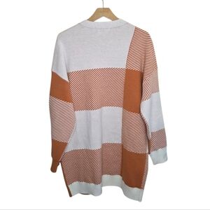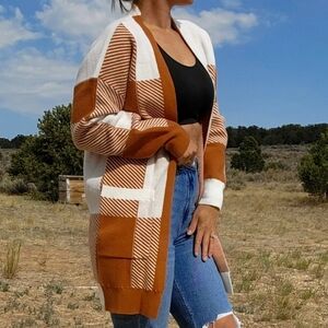 Chunky knit open front cardigan sweater in a rusty orange and ivory blocked plaid.