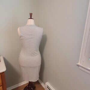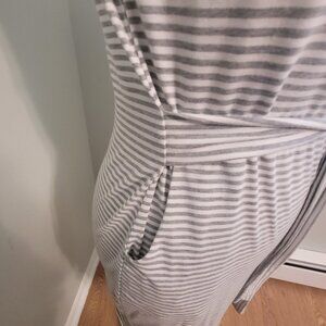 Easy to wear short sleeved T shirt dress! Soft fabric with summery short sleeves, a cute tie waist and handy deep side pockets. Subtle gray stripe pull on dress flatters every figure.