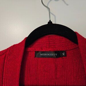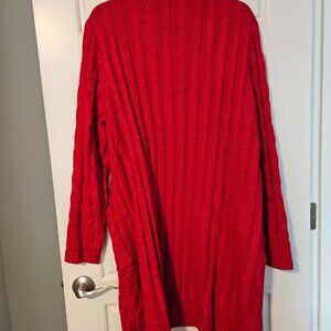 This is a new sweater it's loose and considered a boyfriend style. It has twisted cable knit, button down, solid color, two pockets, above knee length, super cozy and warm. This is a true red. It's 100% acrylic and made in China. Let me know if you have any questions. Thanks for looking.