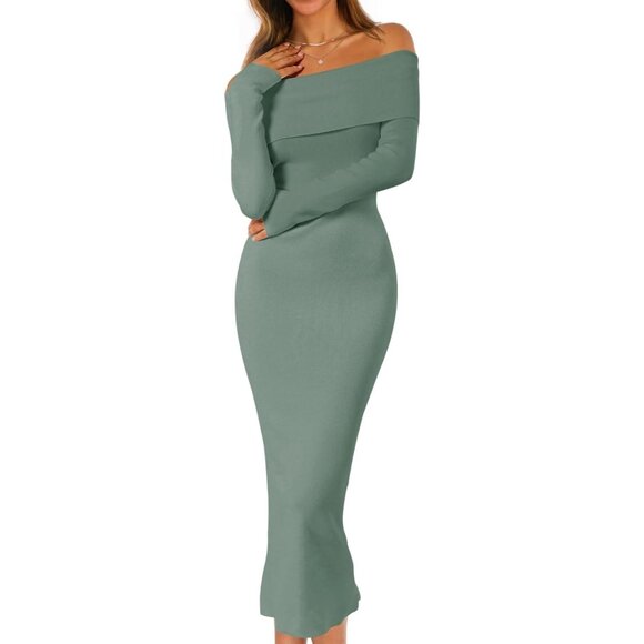 Merokeety Women's Dustygreen Off Shoulder Long Sleeve Elegant Bodycon Midi Dress