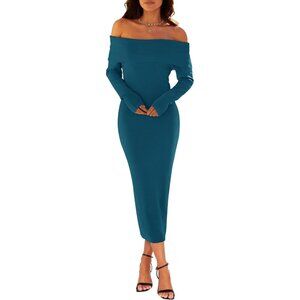 Merokeety Women's Teal Off Shoulder Long Sleeve Elegant Bodycon Midi Dress
