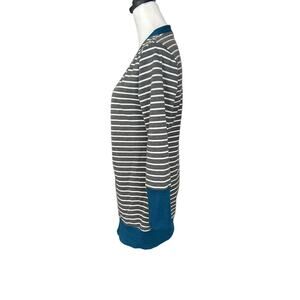 Gently Used in Excellent condition Meroketty Cardigan. Gray white teal. Size small. Snap down front. 95% Polyester, 5% Spandex.