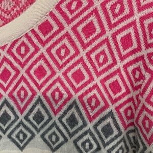 This cardigan has just a touch of whimsy with its throwback to the 80s & preppy vibes, very Academia. Great colors with the gray, pink pattern on a creamy white base. Size large. Button up or leave open, this is going to look adorable no matter what you pair it with!!!