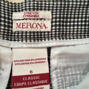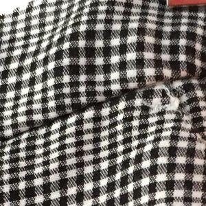 Cute ankle pant in a classic black & white check. 97/3% cotton/spandex mix makes for a smooth fit. Two front slash pokets, two back horozontal pockets, and belt loops. Teeny tear right at left pocket; priced accordingly.