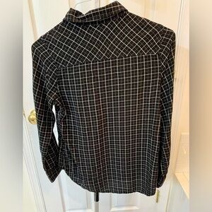 This shirt is black with white checks-size small. Pull over-buttons partway down the front. Excellent condition.