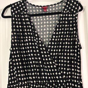 Sleeveless faux-wrap style, black & white geometric print, stretchy 95% polyester / 5% spandex fabric, pull-on style, machine washable, RN 17730.