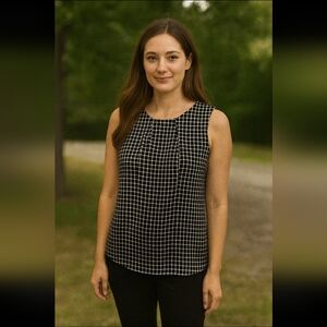 Elevate your casual or work wardrobe with this chic and versatile Merona top. In a classic black and white grid pattern, this sleeveless blouse features a stylish pleated detail at the neckline, adding a touch of sophistication.