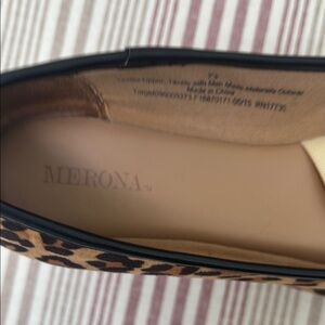 These Merona flats combine elegance and comfort with their smooth leather-like material and classic rounded toe design. The decorative bow detail on the front adds a touch of sophistication, making them perfect for both casual and formal occasions. With a flat sole and a contrasting light interior, these shoes offer both style and versatility.