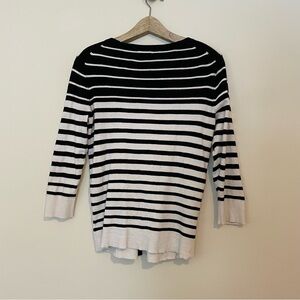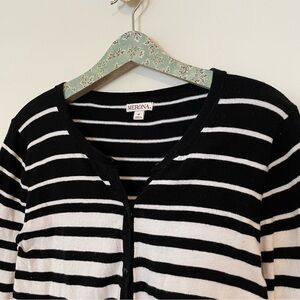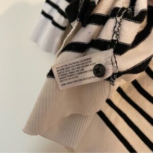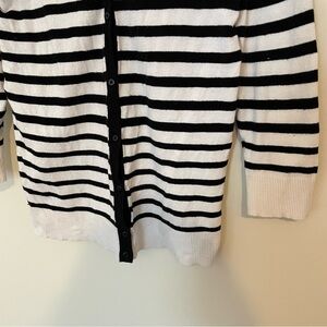 Features: black and white stripes, 3/4 length sleeves, button front, medium weight.