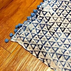 • Other information: Thin material. Blue pom pom accents at both ends.