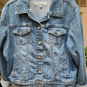 The Merona blue jean jacket showcases a classic denim style with a medium wash and traditional collar. Its durable construction and timeless design make it a versatile addition to any wardrobe. Excellent pre-owned condition. Pit to pit measures 20". Shoulder to bottom is about 19"