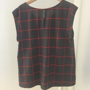 Dark grey blouse in 100% polyester. Soft and silky with a fun red/orange windowpane/grid print. Button closure at neck with keyhole at nape. This has only been worn once or twice and is in great condition with no stains or tears. Easy to wear and care for - machine wash delicate and does not wrinkle! Adds a nice pop of color with a pencil skirt and blazer. Runs a bit small - I usually wear a large (10-12) top and this fits similarly to that.