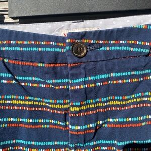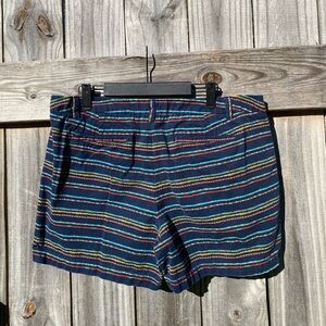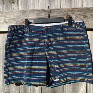 Vibrant shorts with multicolor stripes. Shorts are 100 percent cotton with pockets and button closure. Perfect for casual outings.