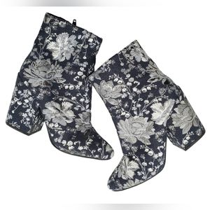 Merona Denim Silver Tapestry Block Heel Ankle Boots Floral Brocade Womens 5.5