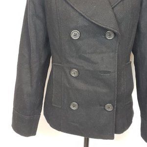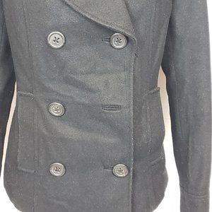 Black wool coat with large lapels. Epaulettes on the shoulders. Double-breasted closure with buttons. 1 button missing. Inside has a black polyester lining.