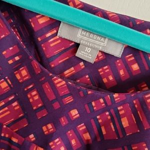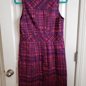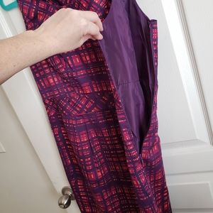 Formal dress. Perfect for a wedding or an interview. It zips up the side and does not have any stretch. The color is purple and coral.