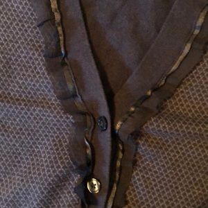 This cardigan is in great condition with no stains or rips. It features a gray pattern with a decorative ribbon detain around the neck and front. Wit us an XL and has long sleeves.