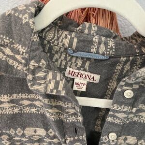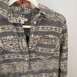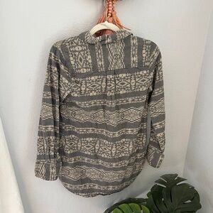 Merona Grey Ivory Aztec Southwestern Pattern Button Down Shirt Blouse Boho Top