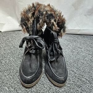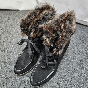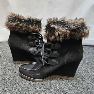 Merona Jaden Faux Suede Shearling Black Wedge Lace Up Boots Size 8