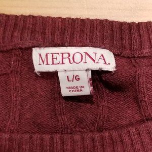 Merona Maroon Crew Neck Long Sleeve Cable Knit Sweater. Has a slightly fitted shape. Material is on the thinner side but soft. It's perfect for cool spring days, especially layered over a tank or tee. Good used condition without any stains and minimal signs of wear. Willing to bundle with other similar sweater and tee listings for a steal of a deal, simply start a bundle and make an offer!