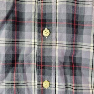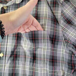 Men’s size L 👔 Classic gray, black & red plaid button-up with long sleeves. Lightweight flannel-look fabric—perfect for layering.