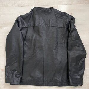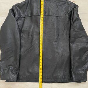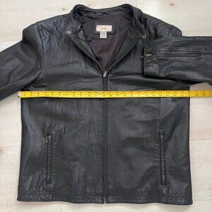 This Merona Men's Soft Leather Jacket is size large. It has an attractive mandarin collar, zipper front, two zipper pockets on either side, and zippers at sleeve cuff. It is very soft leather with polyester lining. One miner flaw is a small rough spot on the back left hip- not very noticeable visually but you can feel it. I took a photo and enlarged it for you to see- otherwise it is in very good condition.