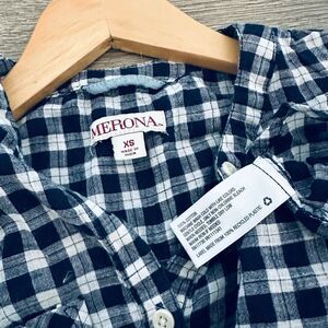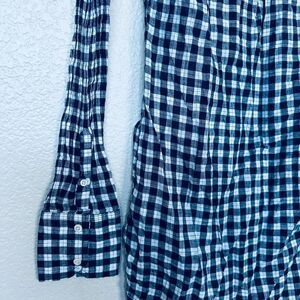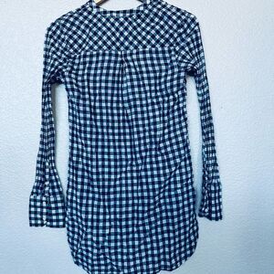 Women’s size XS Merona white and navy blue plaid checkered long sleeve long length tunic top or dress in good preowned condition. No rips stains or tears, clean nonsmoking home. Very lightweight, 100% cotton material. Approx 16” across bust pit to pit laid flat, 15” pit to lower hem side length, 19” pit to wrist sleeve length.