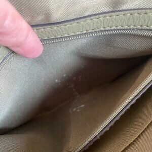 White residue present inside one outer pocket, otherwise excellent condition. Measurements: width = 10.5 inches, height = 8 inches, depth = 3 inches.