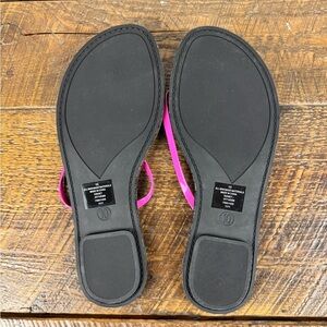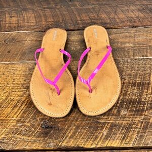 Chic sandals with vibrant pink straps. Comfortable tan sole. Perfect for casual wear.