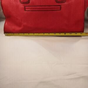 Stylish red Merona handbag featuring a textured faux-leather exterior and soft black interior lining. Classic structured shape with dual top handles and a roomy open interior. Includes multiple inside pockets for organization, plus a zip pocket for secure storage. Clean inside and out with normal light wear only. A bold everyday bag with plenty of space.