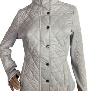 This is a lightweight beige jacket that is in very good condition. It zips and snaps . It goes well with everything.