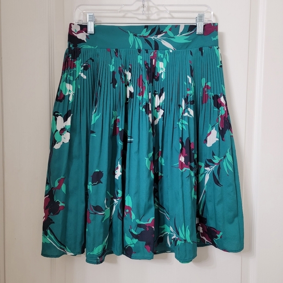Merona Size M Green with Purple Floral Pattern Accordian Pleated Midi Skirt