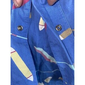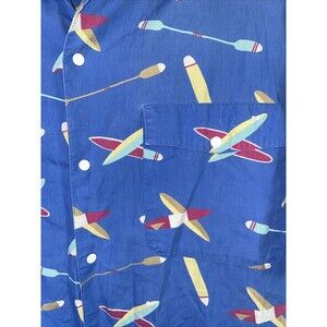 Super vintage fun novelty retro 80s nautical Merona sport mens short sleeve blue snap button button shirt with two front button pockets. all over pattern Paddleboard , oars or surf type pattern. Good used preowned condition.