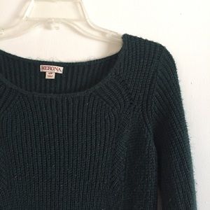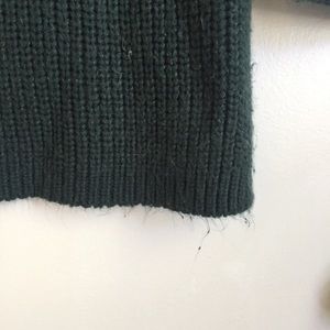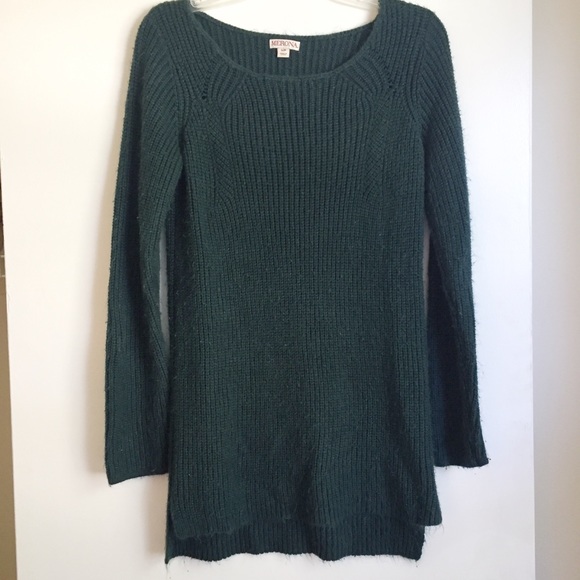 Gorgeous evergreen color. Long enough for leggings and super cozy. A tad longer in the back. A bit fuzzy but no other flaws. 93% Acrylic/5% Polyester/ 2% other fiber.