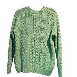 This sweater is a lovely seafoam green color and features a chunky knit design. It's made from a soft and warm wool blend, perfect for keeping you comfortable on chilly days.