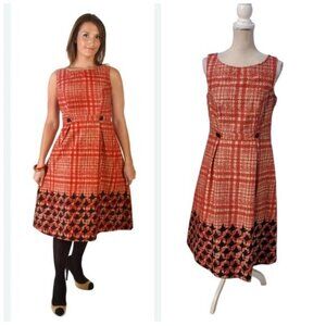 Step into timeless charm with this Merona fit & flare dress in a size 10. Featuring a rich red plaid tweed-style fabric with a striking black geometric floral border, this sleeveless beauty gives off serious Mod Revival, Cottagecore, and Light Academia vibes.