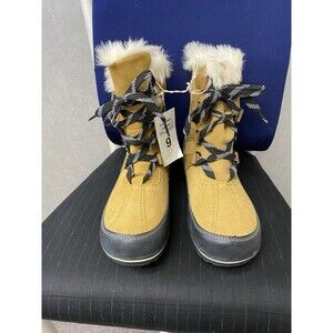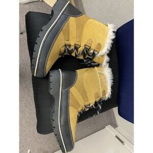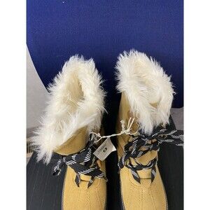 The Merona Tan/Cream Boots are a stylish pair of leather boots designed for women in size 9. These booties feature a classic brown color with a cream accent, making them versatile for various outfits. With a comfortable and fashionable design, these boots from Merona are a perfect addition to any woman's shoe collection.