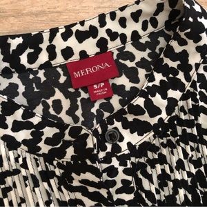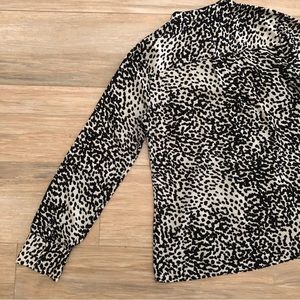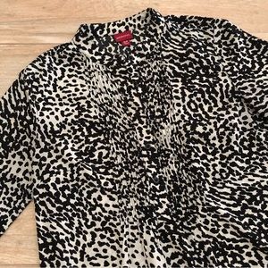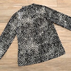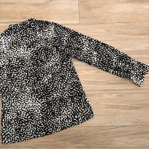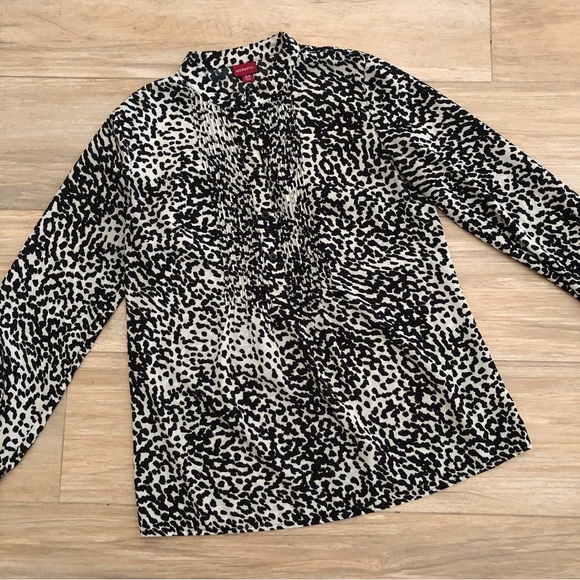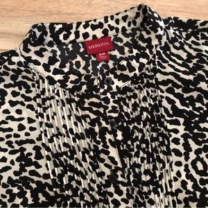 Merona long sleeve blouse. Size S. Black and white. Tuxedo style with pintuck pleats. Half button down. 100% polyester. No stretch. In gently used condition. No flaws or signs of wear. Measurements approximate. See all photos.